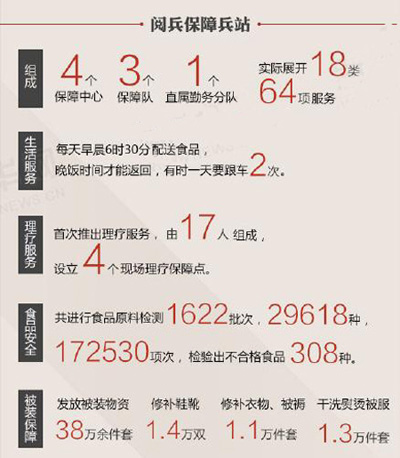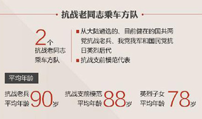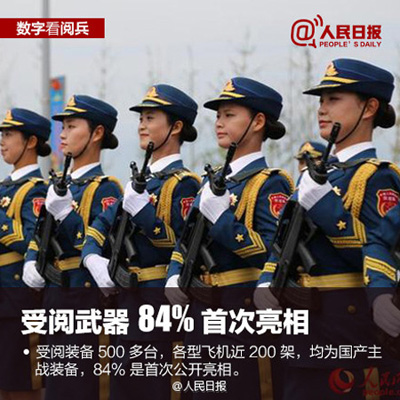 ①56门礼炮,寓意56个民族,交替鸣放70响,庆祝抗战胜利七十周年;②共编50个方队,参阅总兵力超过一万人;③装备500多台,各型飞机近200架,84%是首次亮相;④三军仪仗队由207人组成,为史上最大阵容;⑤50余名将军将受阅,最高军衔是中将。