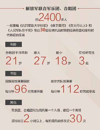 ①将有50余名将军受阅,分别来自陆、海、空、第二炮兵和武警部队,除三军仪仗方队外,其余所有受阅方队均由将军领队。②最大年龄58岁,最小年龄48岁,平均年龄53岁;③最高军衔是中将;④高学历:博士将军领队4人,硕士29人。