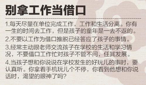 【你有一生去工作,但孩子的童年一去不返】①每天尽量在单位完成工作。②不要以工作为借口推脱已经答应了孩子的事情。③经常主动跟老师交流孩子在学校的生活和学习情况,不要借口工作忙对孩子不管不问,任其发展。陪孩子看些少儿图书少儿书刊。④当你回到家还在忙工作时,你看到孩子渴望和你说话的眼神了吗?